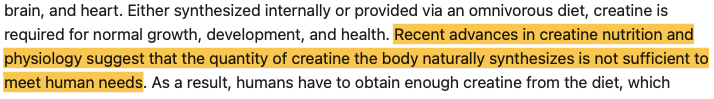Según Ostojic et al. de 2021, aunque el organismo produce creatina, esta cantidad no es suficiente para cubrir adecuadamente las necesidades. Los vegetarianos, los veganos y las personas mayores en particular, que comen poca o ninguna carne, por lo tanto absorben menos creatina y tienen niveles significativamente más bajos de creatina en su plasma sanguíneo, lo que significa que la suplementación con monohidrato de creatina tiene mucho sentido y es aún más eficaz.
