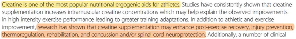 El hecho de que la creatina es uno de los suplementos más importantes en el deporte también se confirma en la actualización de la revisión de la Sociedad Internacional de Nutrición Deportiva (ISSN) de 2017, que no solo ve la creatina como el suplemento más eficaz para mejorar el rendimiento y construir músculo, sino que también demuestra muchos otros aspectos positivos, como la mejora de la regeneración, la protección contra lesiones y la termorregulación.