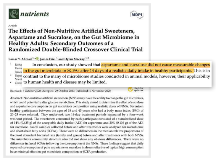 Un estudio clínico reciente, que no se publicó hasta noviembre de 2020 e investigó el efecto del aspartamo y la sucralosa en el microbioma intestinal de adultos sanos, muestra de nuevo que no se pudieron detectar efectos negativos en el microbioma intestinal. El estudio analizó el consumo de sucralosa y aspartamo en cantidades normales durante un periodo de dos semanas. Tras analizar las muestras fecales, no se encontraron diferencias entre el consumo de los edulcorantes aspartamo y sucralosa.